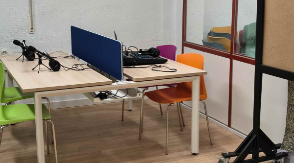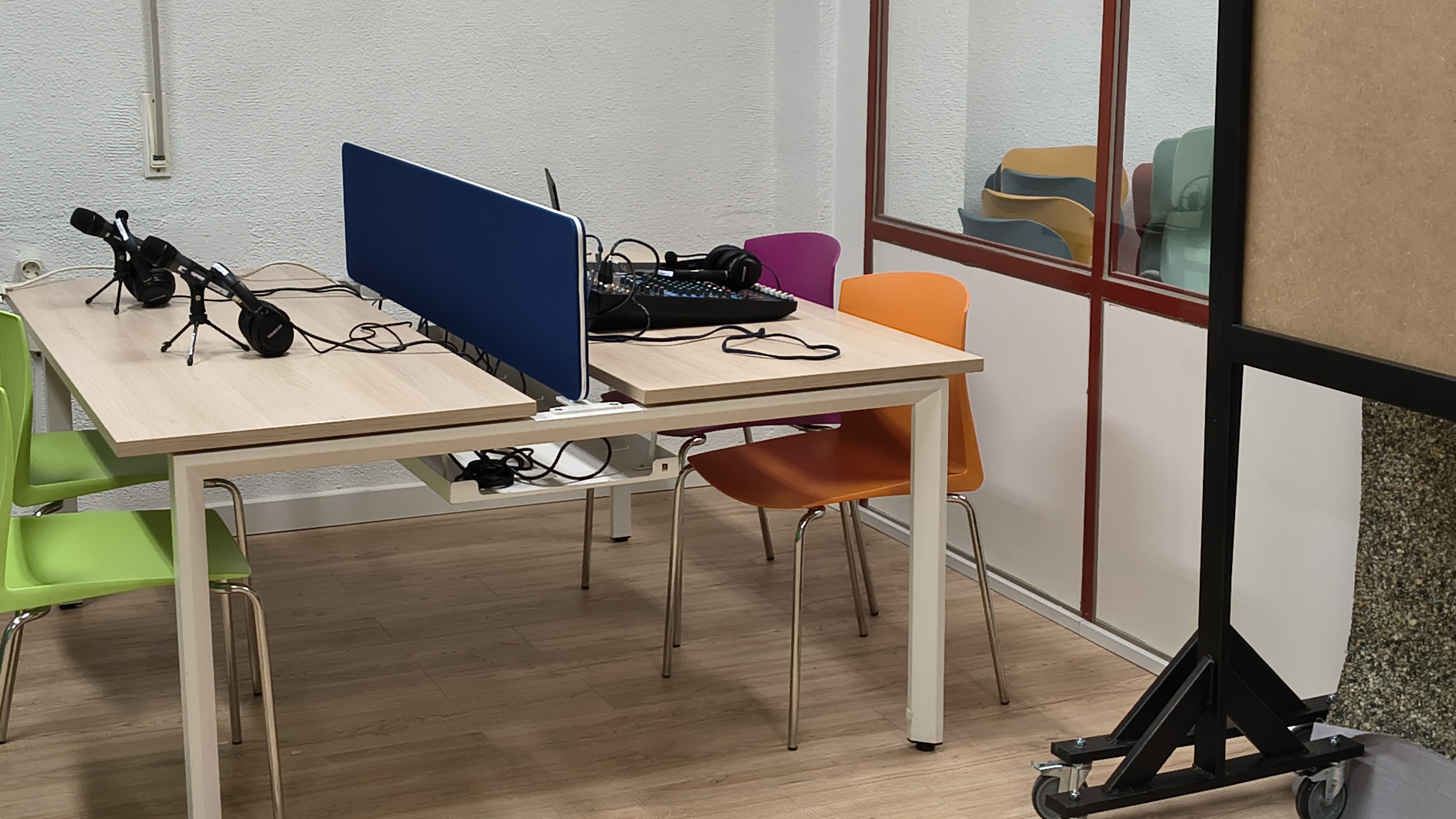 El aula dispone de pantalla digital interactiva, mobiliario flexible, espacio de presentación, zona de grabación con croma y área de radio, lo que permite desarrollar proyectos multimedia, presentaciones y actividades colaborativas.